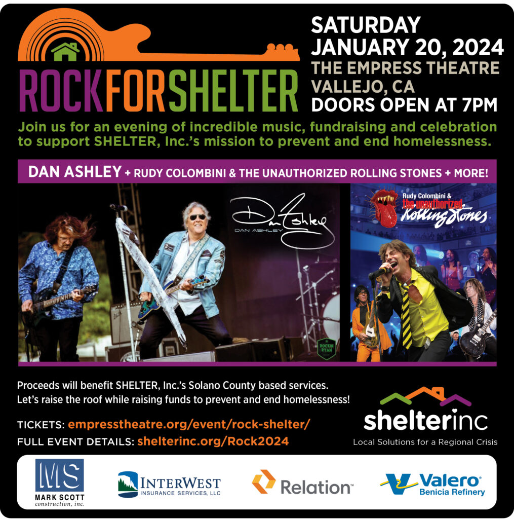 Saturday, January 21, 2023 Rock for SHELTER at The Empress Theater, Vallejo. Multi-band concert with local television anchor/musician Dan Ashley as master of ceremonies.